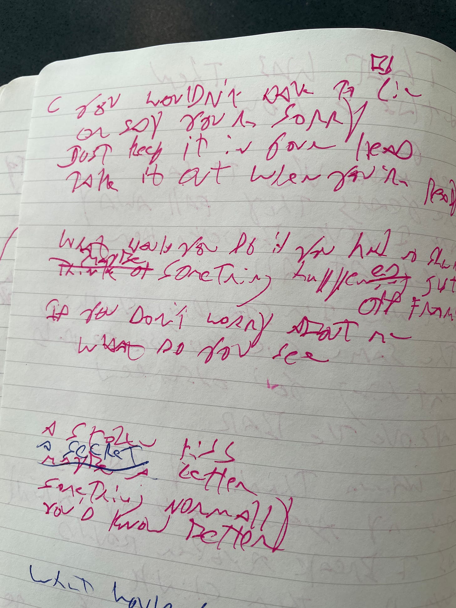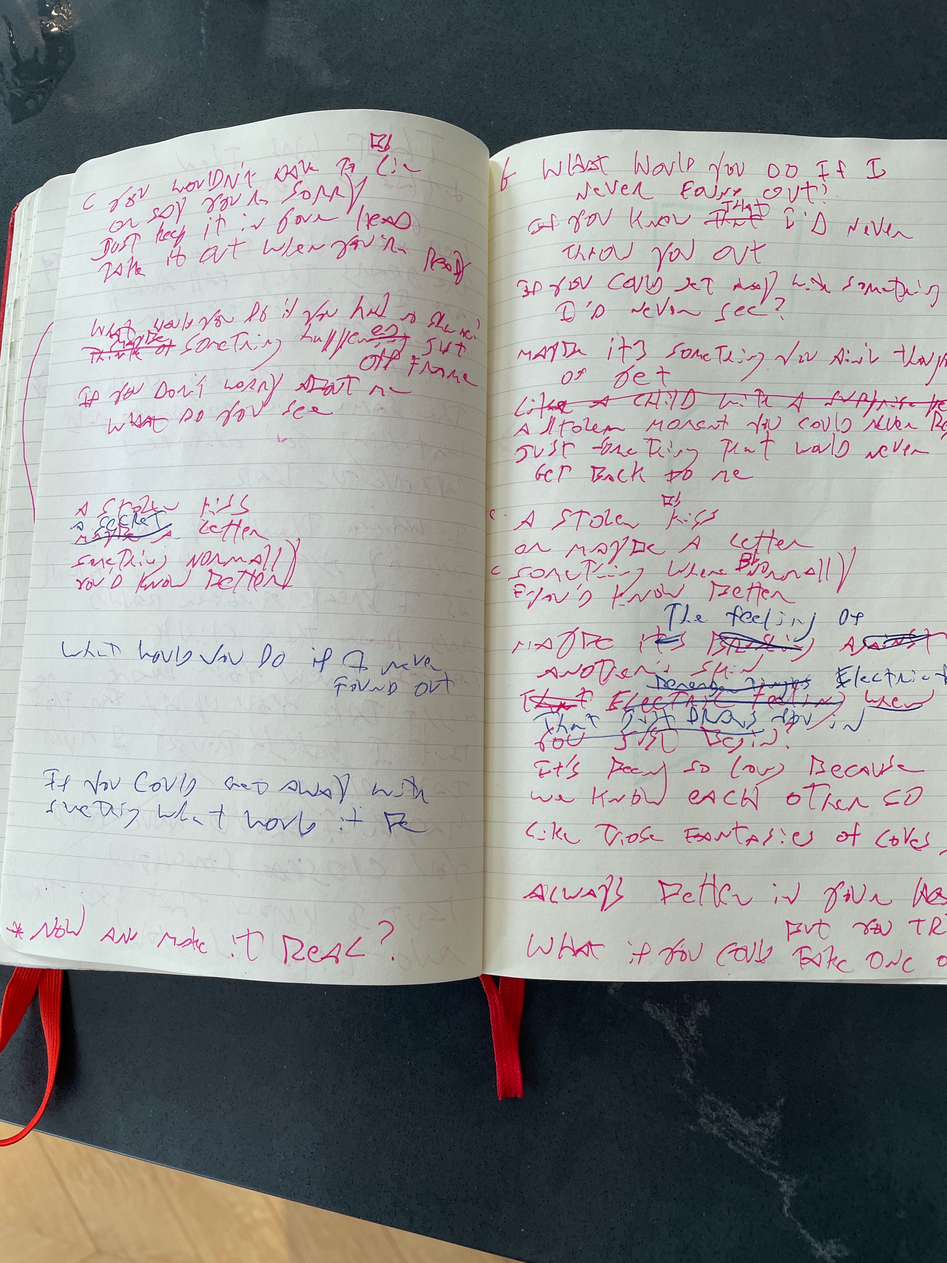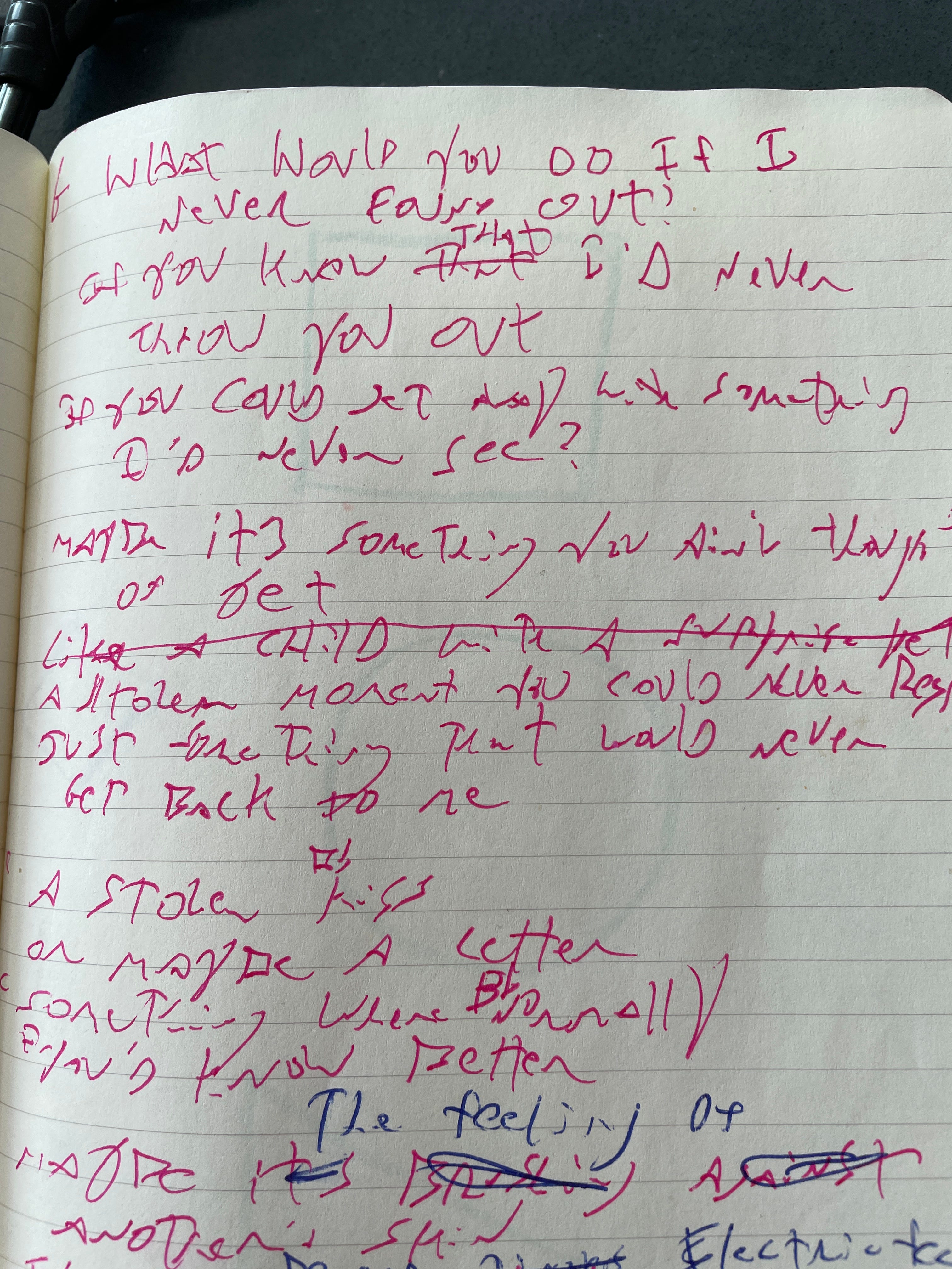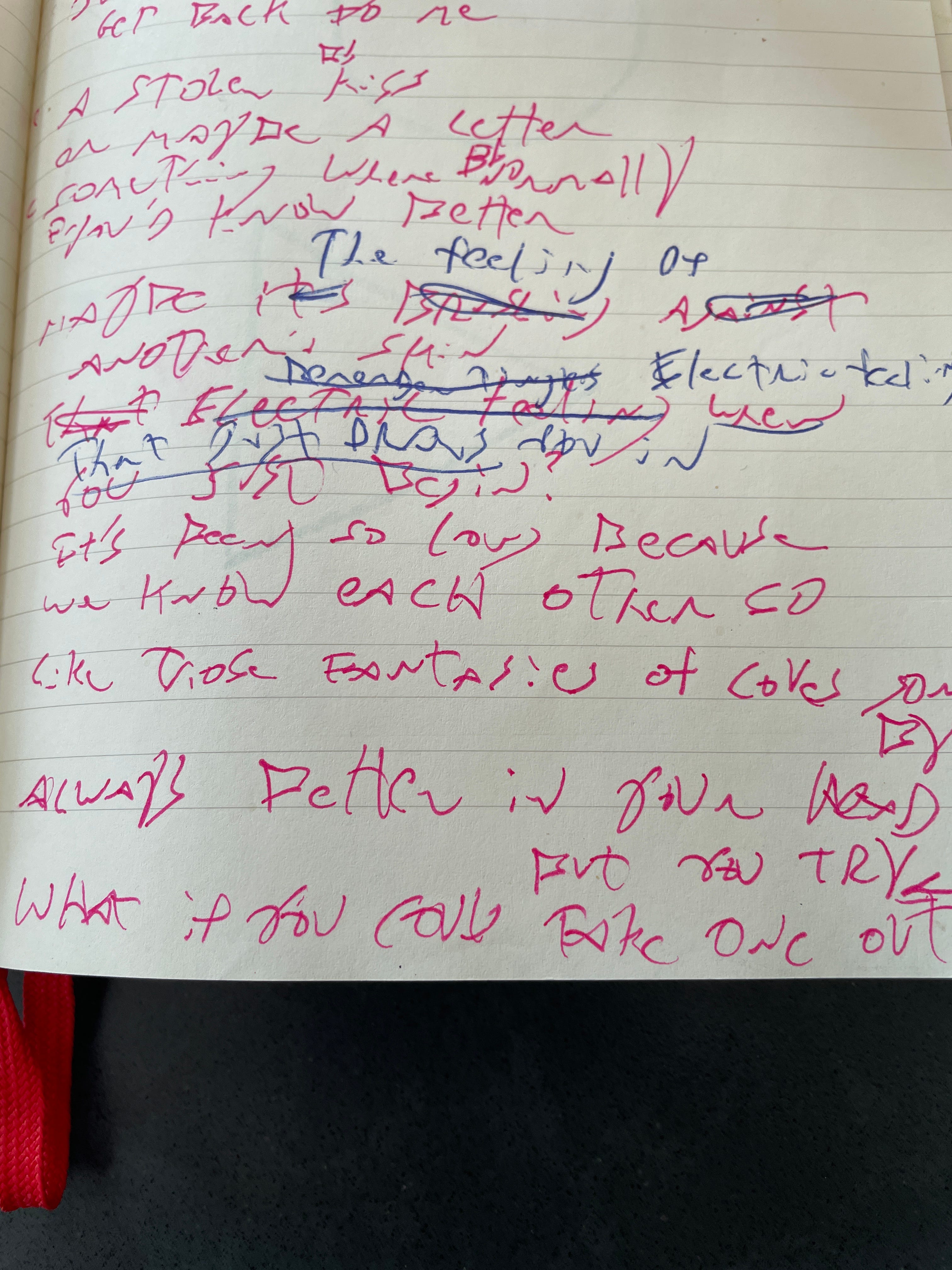 Looking at the notebook pages from when I wrote the song, there’s very little crossed out, relatively speaking. Some songs of mine have entire pages X’d out, but on this one there’s really only a few lines. That dovetails with what I remember about writing it, which is that it all came out pretty quick. Maybe that was inspiration, plus the fact that I was in an intense period of creating a lot of songs really quickly. In any case, some of those crossed out lines are in the second verse, where I started going for different vowel sounds on those long ending harmonies and trying different ways of getting there. So, singing mostly nonsense and playing, I liked ending up on ‘ooooo’ and then ‘real’. So I started thinking about feelings that would get you to cheat on your partner and about that spark that feels like a high with a new person, which became “maybe it’s brushing against another’s skin, electric feeling when you just begin”, and then I started thinking about the gloss of memory, and how we romanticize things looking back on them, which came out “like those fantasies of loves gone by, always better in your head but you try, what if you could take one out and make it real?'“
